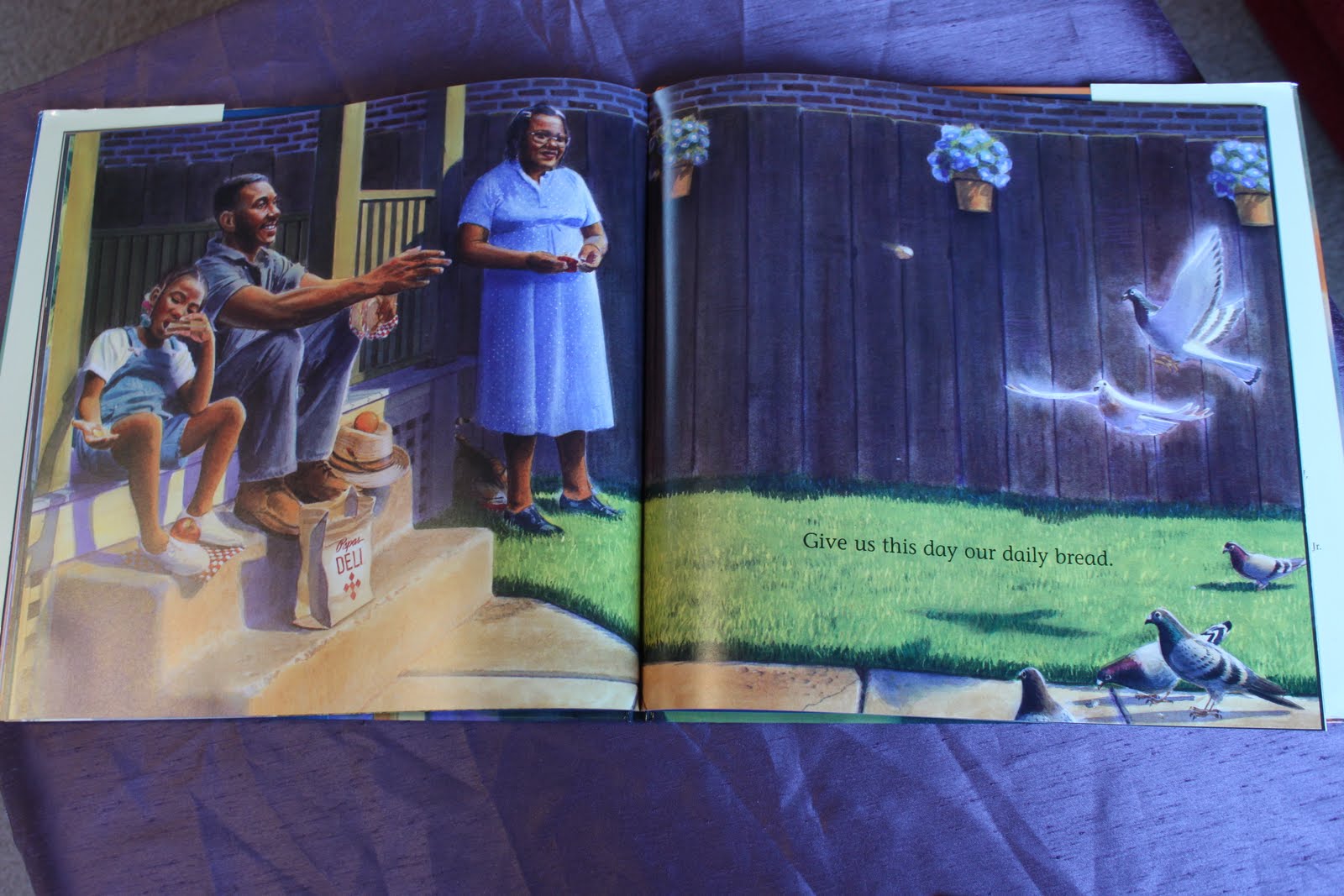 First, Time Ladwig's The Lord's Prayer: This book is modern in its approach and shows a complete story in the illustrations that illuminates the meaning of the prayer in an everyday setting. A father and daughter go to an older woman's home to help fix up her yard and fence. They do the work and the little girl is tempted to take a necklace that she finds (which has the Lord's Prayer on it). The illustrations are thoughtful and there are lots of things to discuss through the book with an older child.